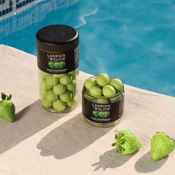 Imagine freshly picked green strawberries together with exquisite red liquorice in a sweet, fruity bite. Enjoy how fresh and sour notes from crispy, green strawberries are perfectly balanced with chewy red liquorice, all swirled in silky white chocolate and a crunchy, green sugar shell for an extra sour twist.
