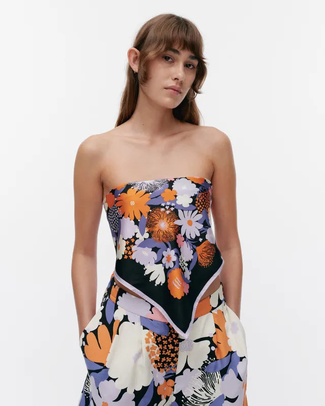 The Marimekko Lauhtua silk scarf is made of silk twill, and it features their Suvikimppu pattern. The scarf comes in the gift box.
